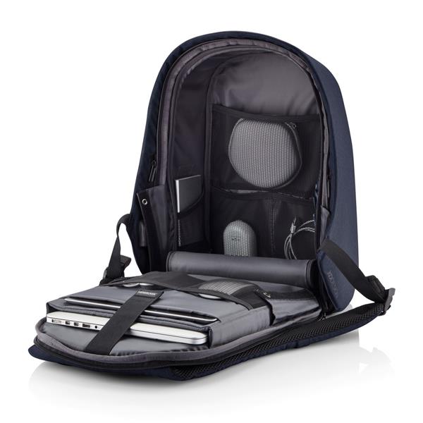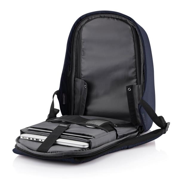 Plecak chroniący przed kieszonkowcami Bobby Hero XL, wodoodporny i odporny na przecięcia materiał, wykonany z przyjaznego środowisku materiału RPET, ukryte zamki i kieszenie, wewnątrz miękkie przegrody na laptopa do 17″ i tablet do 12,9″, zintegrowany port USB do ładowania telefonów (power-bank nie jest dołączony), odblaskowe paski zwiększające widoczność, pasek do zamocowania na walizce, wzór zastrzeżony®, ślad węglowy produktu: 7,57 kg CO2