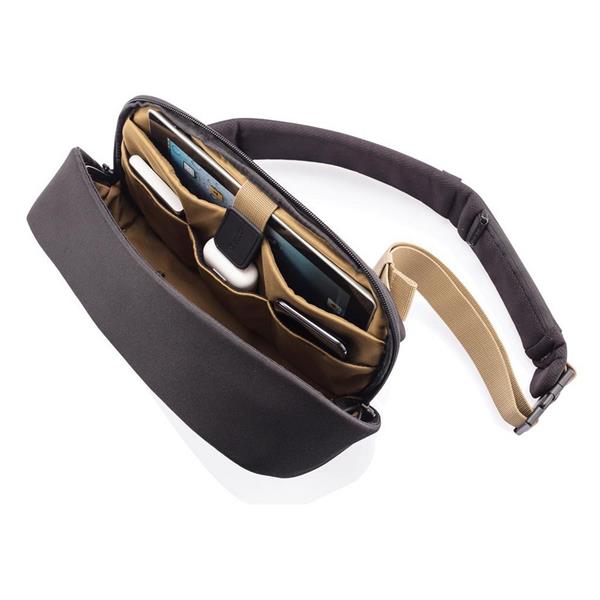 Plecak chroniący przed kieszonkowcami Bobby Sling z miękkim paskiem na ramię, wodoodporny i odporny na przecięcia materiał, 3 punktowa klamra bezpieczeństwa, zintegrowany port USB do ładowania telefonów (power-bank nie jest dołączony), kieszeń RFID, ukryte zamki i kieszenie, ślad węglowy produktu: 3,38 kg CO2