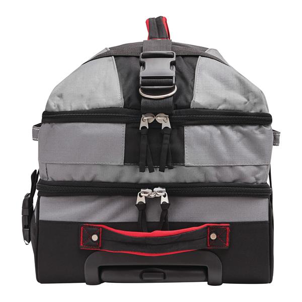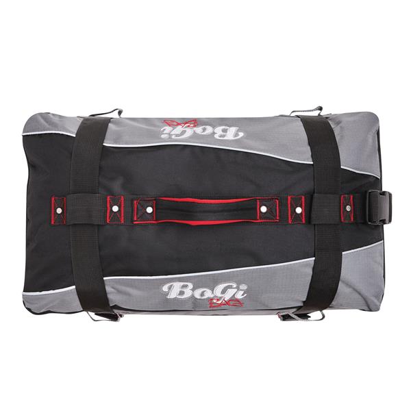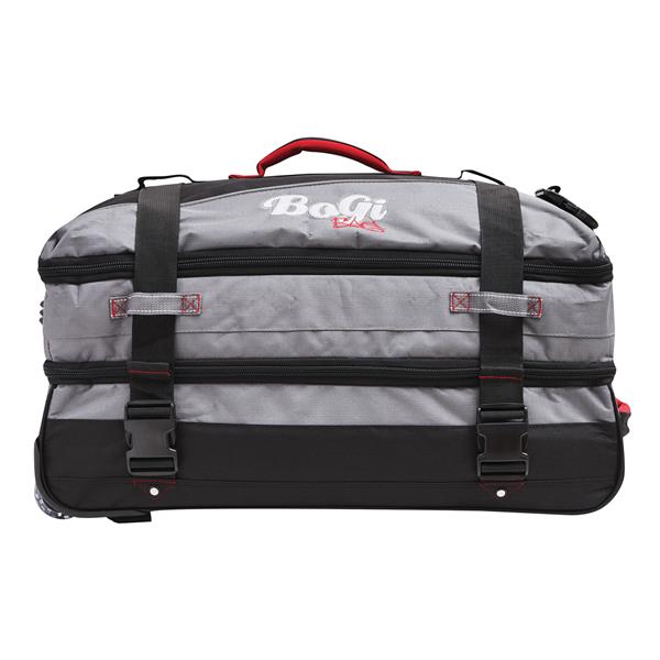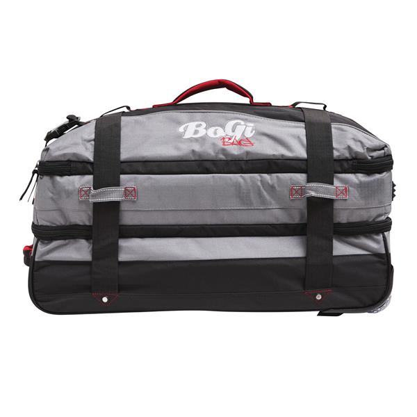 Torba podróżna na kółkach BoGi L: oddzielne poziomy pakowania zapinane na zamek błyskawiczny, komora główna z 2 przegródkami, 1 kieszeń siatkowa zapinana na zamek w jednej z przegród, 2 kieszenie wewnętrzne zapinane na zamek, 2 wyściełane uchwyty, chowany uchwyt wózka, 2 paski kompresyjne z boczną klamrą, okienko adresowe z tyłu, lekkobieżne kółka do jazdy z osłonami narożnymi, 2 szyny ślizgowe chroniące torbę na schodach, nóżki, dołączony zamek szyfrowy.