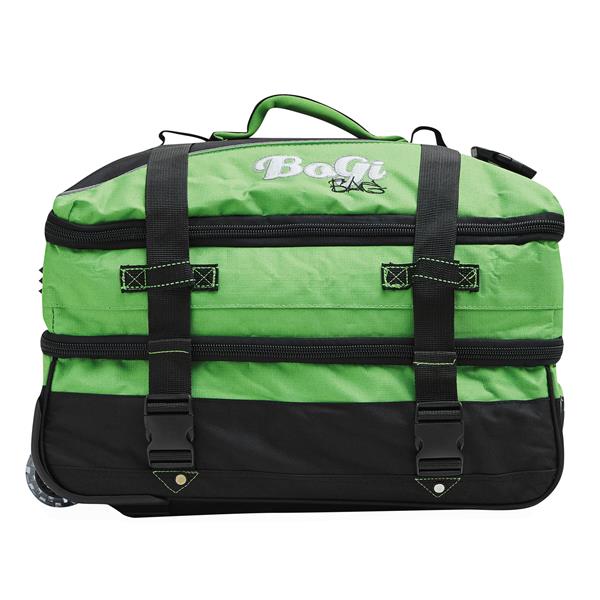 Torba podróżna na kółkach BoGi S: oddzielne poziomy pakowania zapinane na zamek błyskawiczny, komora główna z 2 przegródkami, 1 kieszeń siatkowa zapinana na zamek w jednej z przegród, 2 kieszenie wewnętrzne zapinane na zamek, 2 wyściełane uchwyty, chowany uchwyt wózka, 2 paski kompresyjne z boczną klamrą, okienko adresowe z tyłu, lekkobieżne kółka do jazdy z osłonami narożnymi, 2 szyny ślizgowe chroniące torbę na schodach, nóżki, dołączony zamek szyfrowy.