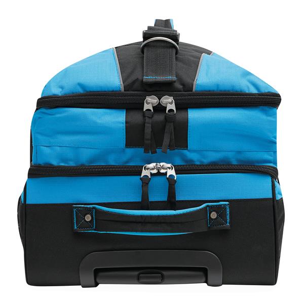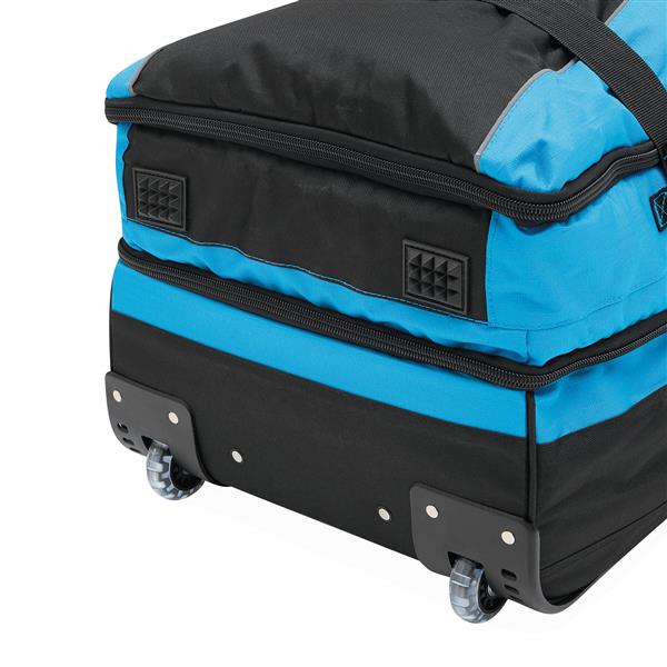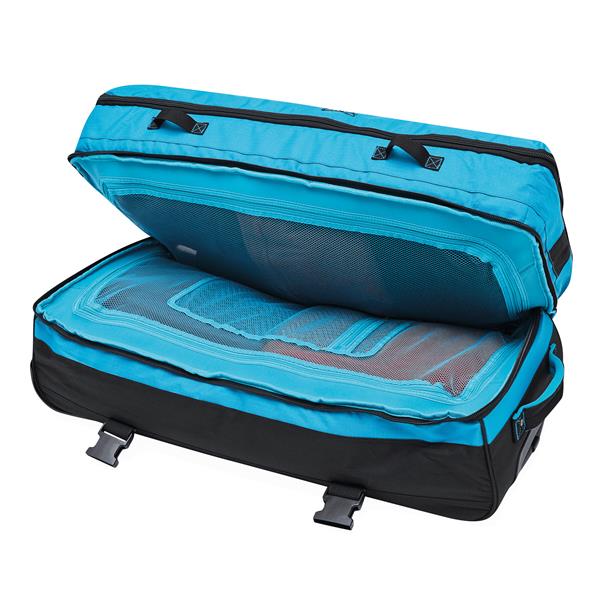 Torba podróżna na kółkach BoGi XL: oddzielne poziomy pakowania zapinane na zamek błyskawiczny, komora główna z 2 przegródkami, 1 kieszeń siatkowa zapinana na zamek w jednej z przegród, 2 kieszenie wewnętrzne zapinane na zamek, 2 wyściełane uchwyty, chowany uchwyt wózka, 2 paski kompresyjne z boczną klamrą, okienko adresowe z tyłu, lekkobieżne kółka do jazdy z osłonami narożnymi, 2 szyny ślizgowe chroniące torbę na schodach, nóżki, dołączony zamek szyfrowy.
