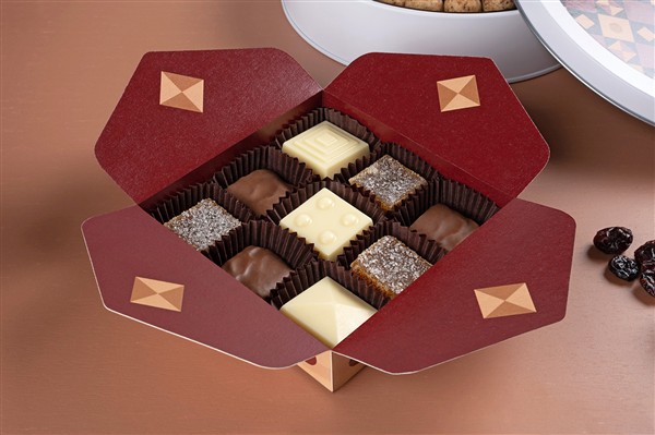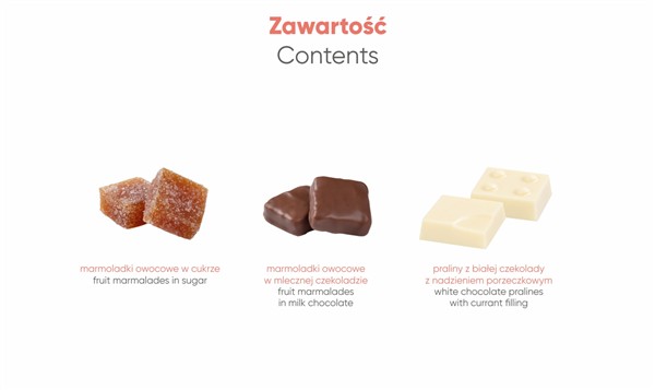 Bombonierka Owocowa Mozaika 9 szt. to ekskluzywny zestaw 9 ręcznie robionych marmoladek o smaku morelowym, które zachwycają wyrafinowanym połączeniem owocowego smaku z doskonałą belgijską czekoladą z certyfikatem Cocoa Horizons lub w wersji sauté, delikatnie posypanej cukrem. Zestaw uzupełnia pralinka z białej czekolady z nadzieniem porzeczkowym.