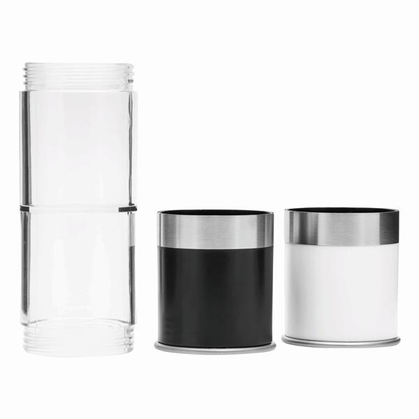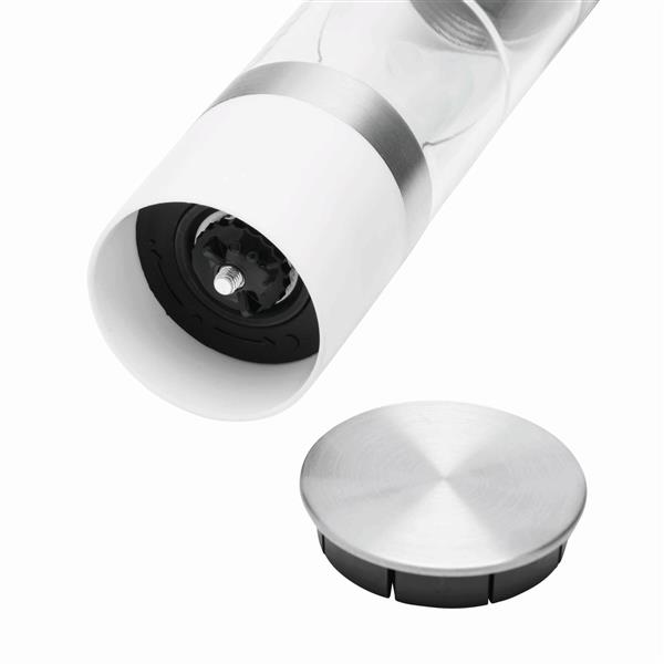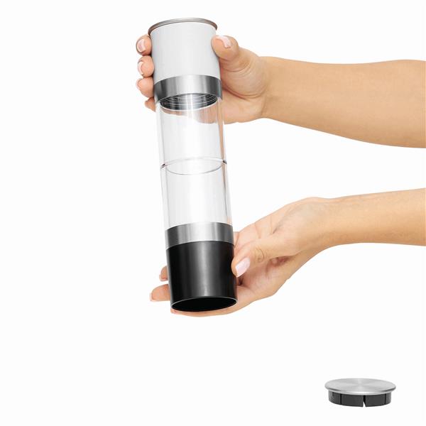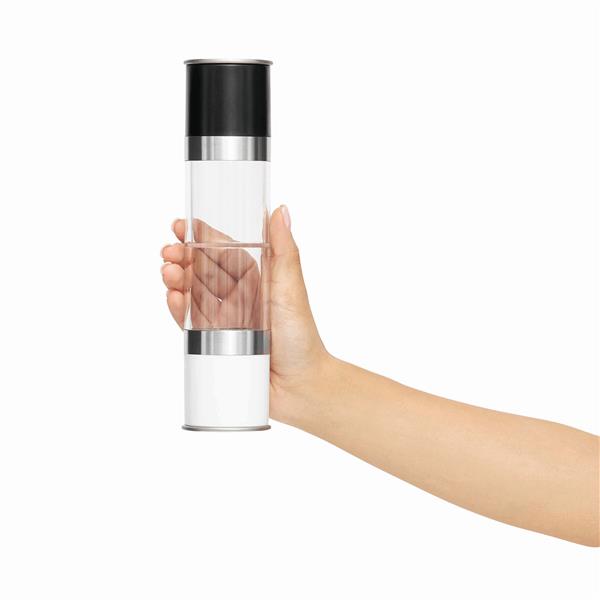 Młynek do soli i pieprzu BOTH TOGETHER z przezroczystą ścianką oraz obrotowym mechanizmem z obu stron – z jednej do rozdrabniania soli, a z drugiej do mielenia pieprzu.