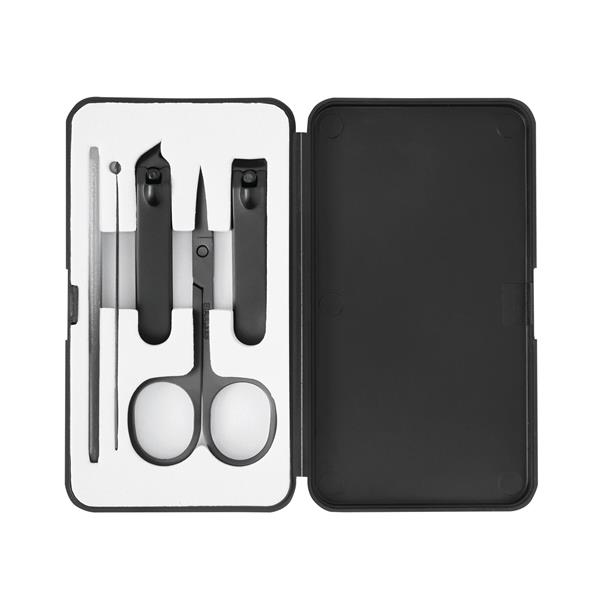 Zestaw do manicure BOXED. Składa się z 5 elementów: szklanego pilnika do paznokci, 2 stalowych obcinaczek do paznokci (jedna ze skośną końcówką), nożyczek do paznokci ze stali nierdzewnej i patyczka do uszu, całość w prostokątnym plastikowym etui. Zapakowany jest w pudełko.