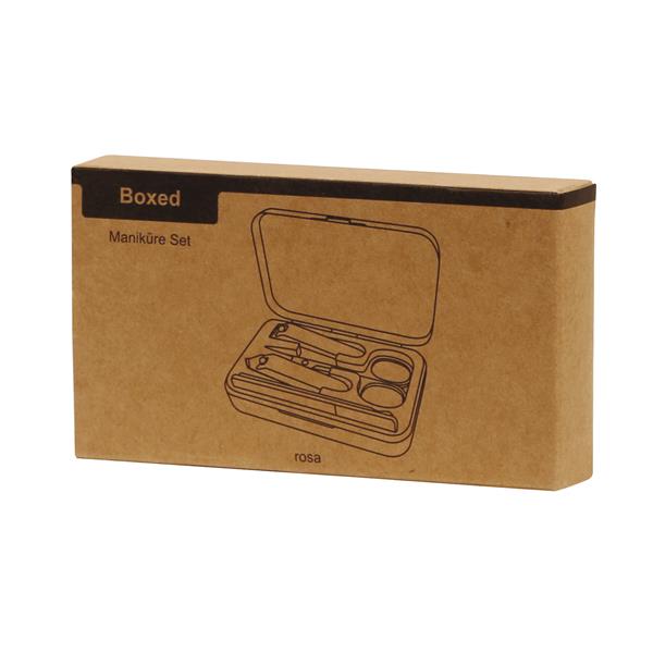 Zestaw do manicure BOXED. Składa się z 5 elementów: szklanego pilnika do paznokci, 2 stalowych obcinaczek do paznokci (jedna ze skośną końcówką), nożyczek do paznokci ze stali nierdzewnej i patyczka do uszu, całość w prostokątnym plastikowym etui. Zapakowany jest w pudełko.