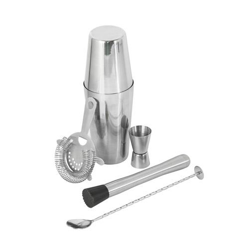 6-częściowy zestaw do koktajli ze stali nierdzewnej: shaker (600 + 450 mL), miarka (30 mL), łyżka, tłuczek i sitko. Zestaw zawiera etui z materiału non-woven. Dostarczany w pudełku upominkowym. Pudełko: 98 x 98 x 290 mm