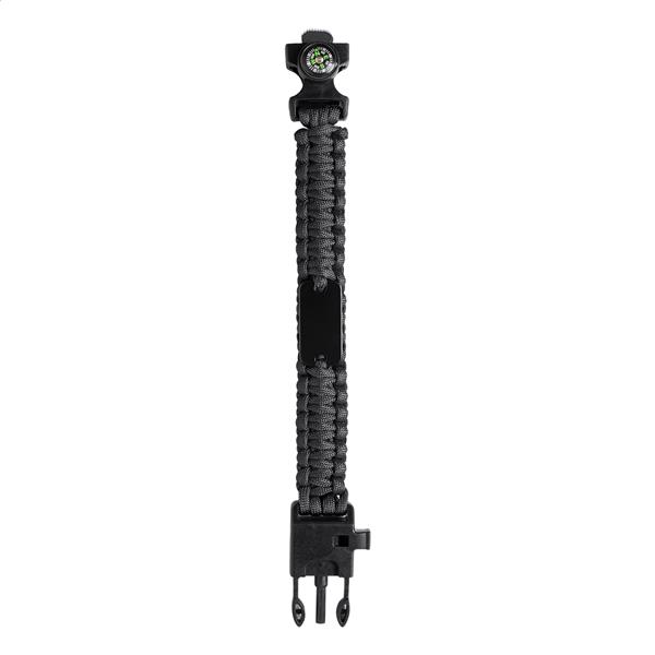 Wielofunkcyjna bransoletka przetrwania z nylonowym, bardzo wytrzymałym paskiem, kompasem, gwizdkiem i krzesiwem.