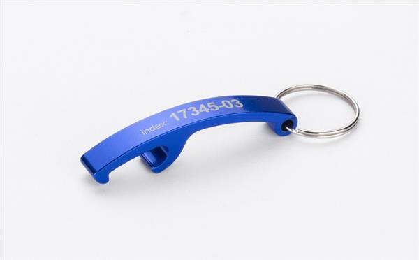 Aluminiowy brelok do kluczy z funkcją otwieracza, dostępny w pięciu kolorach. Pakowany w woreczek foliowy.