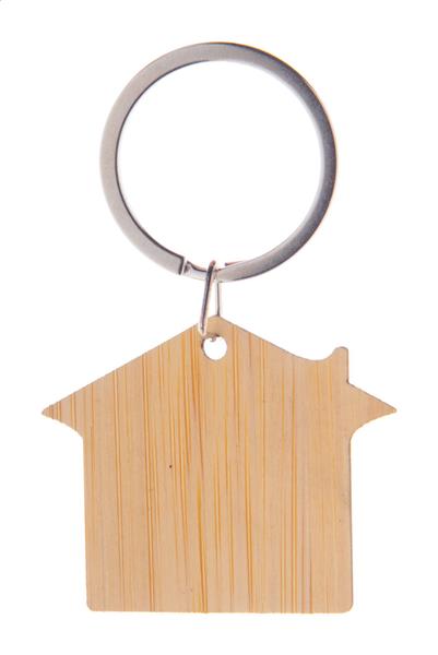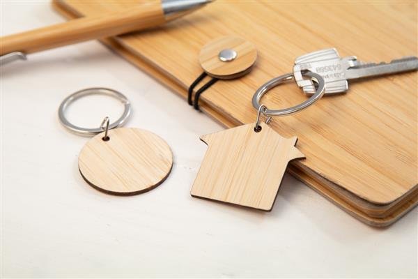 Bambusowy brelok w kształcie domku z metalowym kółkiem.