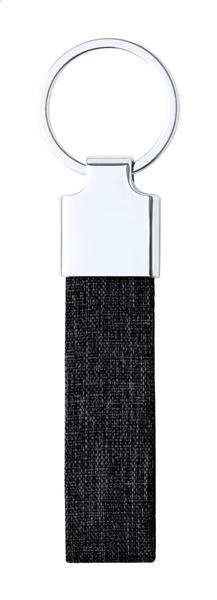 Metalowy brelok z poliestrowym paskiem RPET. Description: Metalowy brelok z poliestrowym paskiem RPET. Primary Color: czarny Material 1: Metal Material 2: Poliester z recyklingu PET Rozmiar: 23×87×8 mm