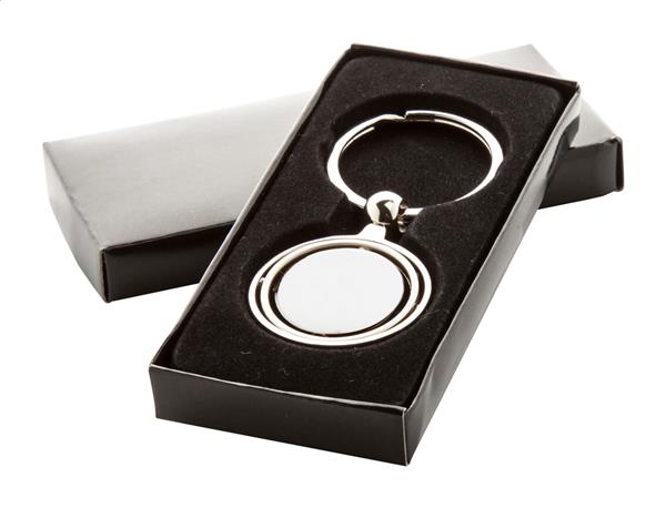 Brelok z obracanym elementem w środku, w czarnym pudełku. Description: Brelok z obracanym elementem w środku, w czarnym pudełku. Primary Color: srebrny Material 1: Metal Rozmiar: o35×95 mm