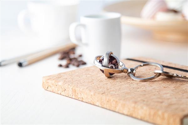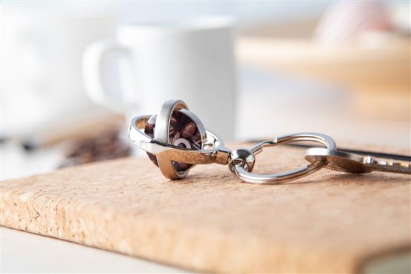 Brelok z obracanym elementem w środku, w czarnym pudełku.