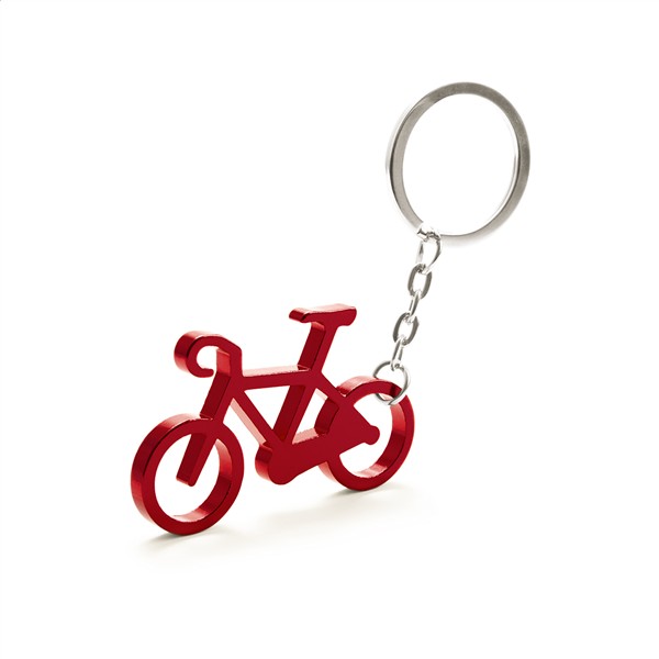 Aluminiowy brelok w kształcie roweru z otwieraczem do butelek.
