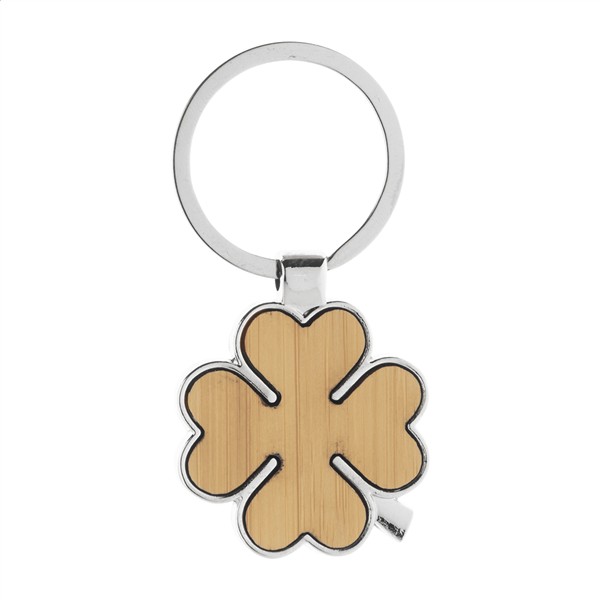 Metalowy brelok w kształcie czterolistnej koniczyny z wkładką bambusową. W pudełku z papieru kraft.