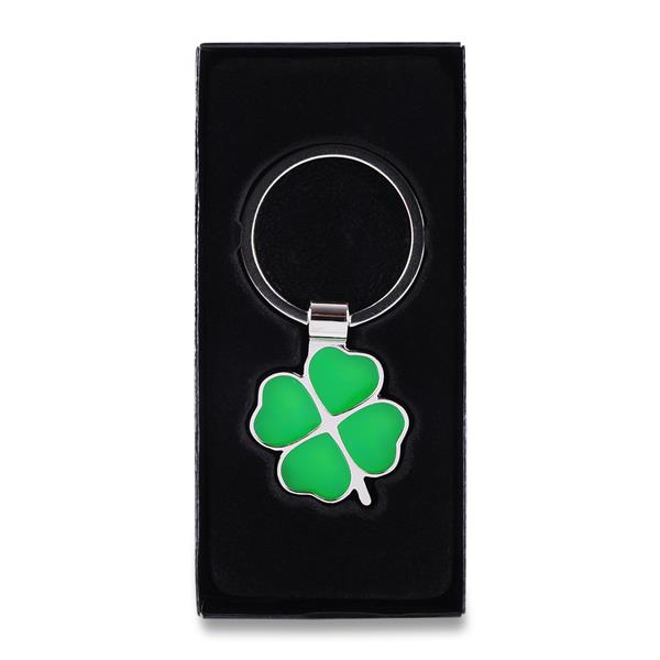 Metalowy brelok w kształcie koniczynki. Pakowany w czarne opakowanie upominkowe.