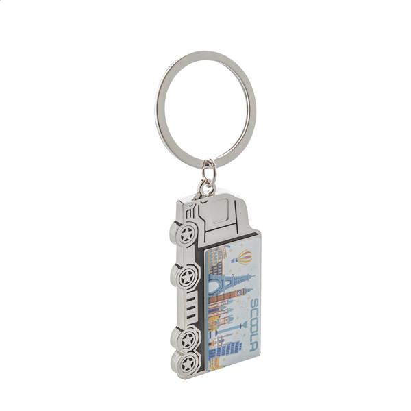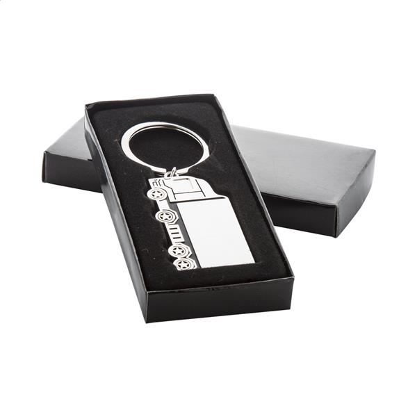 Metalowy brelok do kluczy w kształcie ciężarówki, w czarnym papierowym opakowaniu.