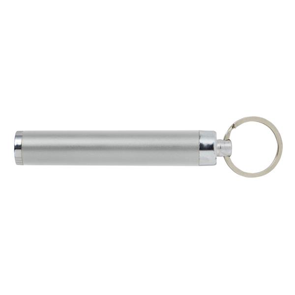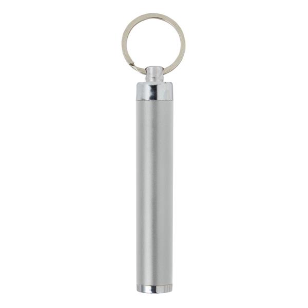 Kieszonkowa latarka LED z brelokiem umożliwiającym przyczepienie do kluczy, grawer ukazuje podświetlaną powierzchnię, niewielki rozmiar