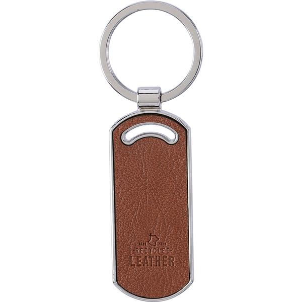 Brelok do kluczy w owalnym kształcie i z kółkiem do przyczepienia kluczy, ikona skóry z recyklingu wytłoczona na produkcie, zapakowany w rękaw z kartonu, produkt wykonany z metalu i PP