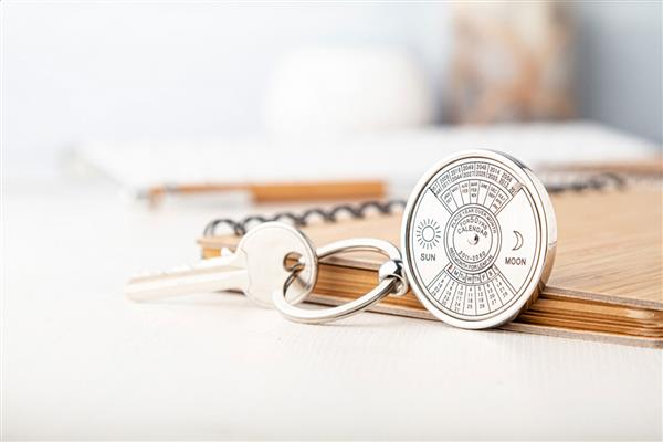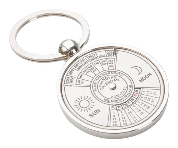 Metalowy brelok z obrotowym kalendarzem do 2060roku. W czarnym pudełku.
