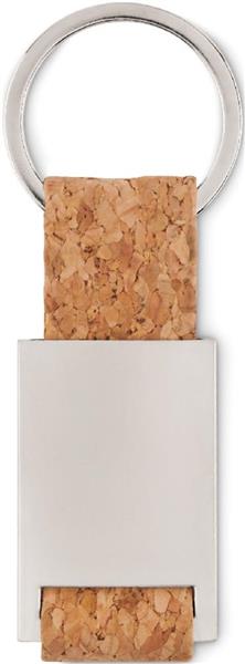 Metalowy prostokątny brelok do kluczy z korkową taśmą. Korek jest materiałem w 100% naturalnym.
