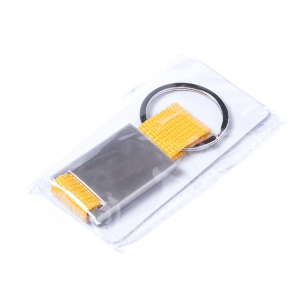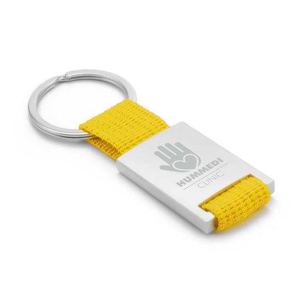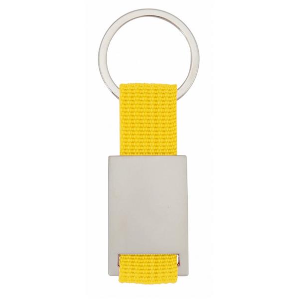 Brelok do kluczy z metalową plakietką przeznaczoną pod znakowanie, produkt wykonany z metalu i poliestru