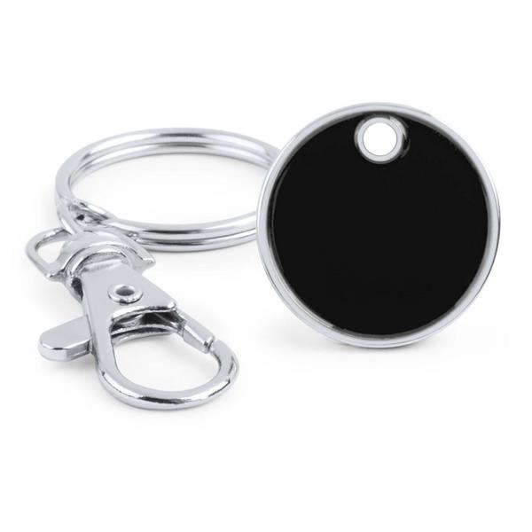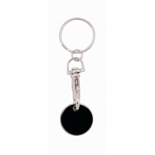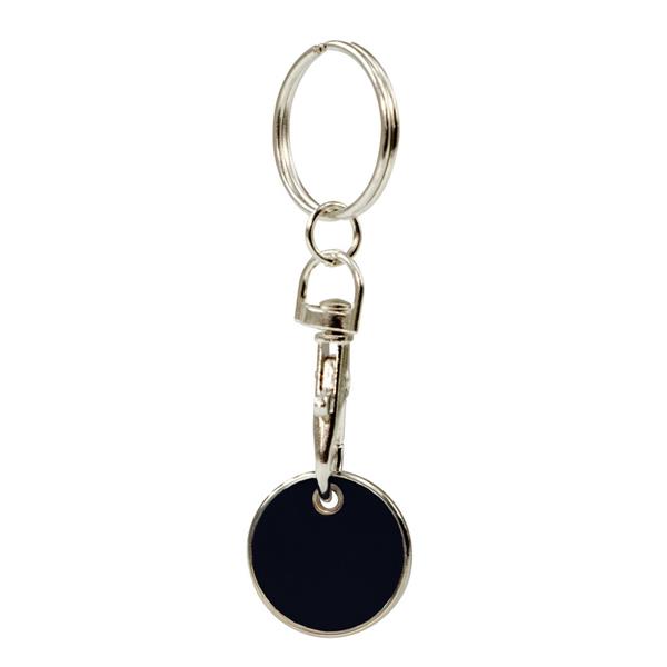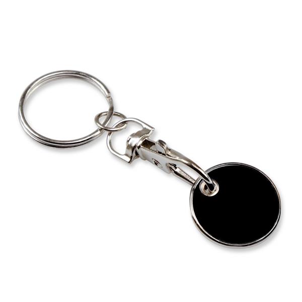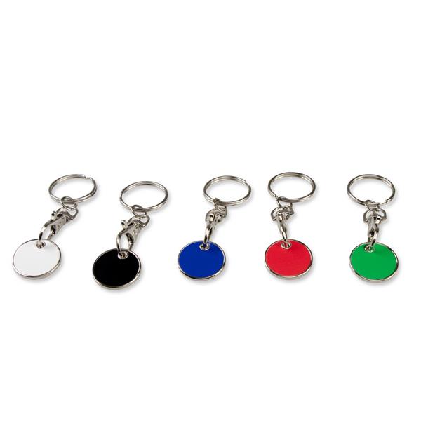 Brelok do kluczy z karabińczykiem umożliwiającym przypinanie, posiada wyjmowany żeton do wózka na zakupy w rozmiarze 1 zł, produkt wykonany z metalu