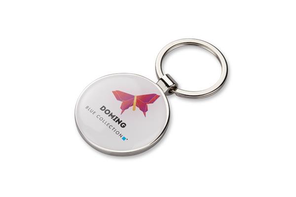 DOMIO to okrągły brelok wykonany z wysokiej jakości metalu, zaprojektowany z myślą o usłudze znakowania metodą doming. Dzięki tej technologii, możliwe jest precyzyjne naniesienie logo firmy w formie estetycznej naklejki żywicznej, która tworzy efekt zbliżony do trójwymiarowego obrazu.