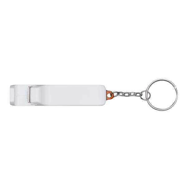 Brelok DOUBLE OPEN z wysuwaną podstawką na smartfon i zintegrowanym otwieraczem do butelek.