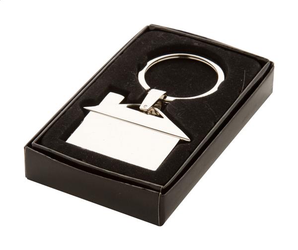 Metalowy brelok w kształcie domu w czarnym kartonowym pudełku.