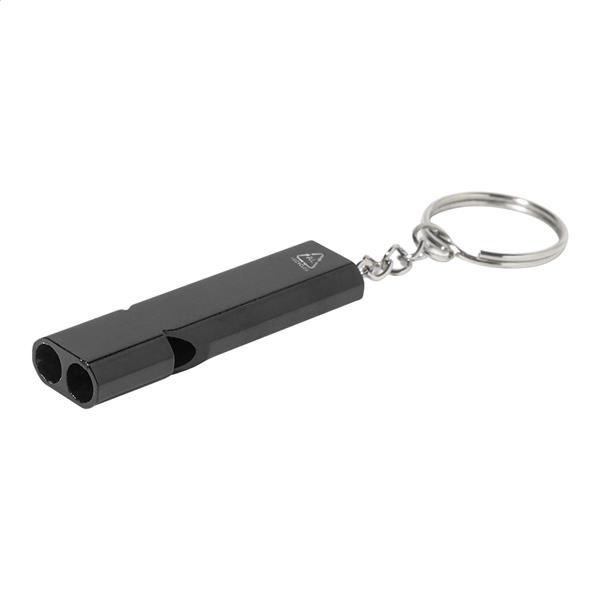 Gwizdek wykonany z recyklingowanego aluminium z metalowym kółkiem do kluczy.