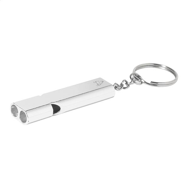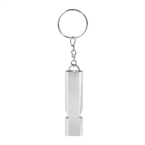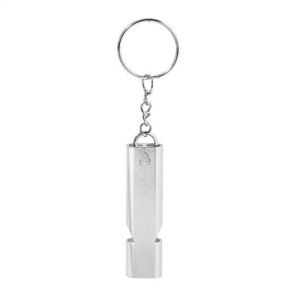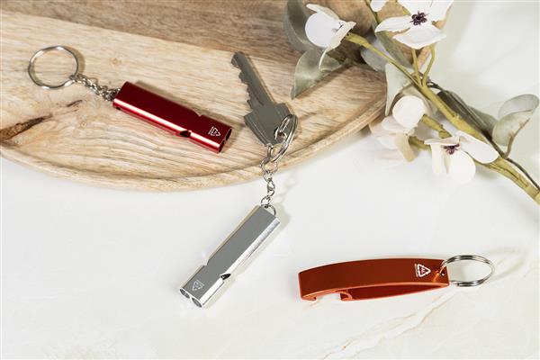 Gwizdek wykonany z recyklingowanego aluminium z metalowym kółkiem do kluczy.