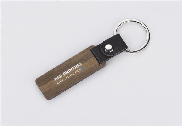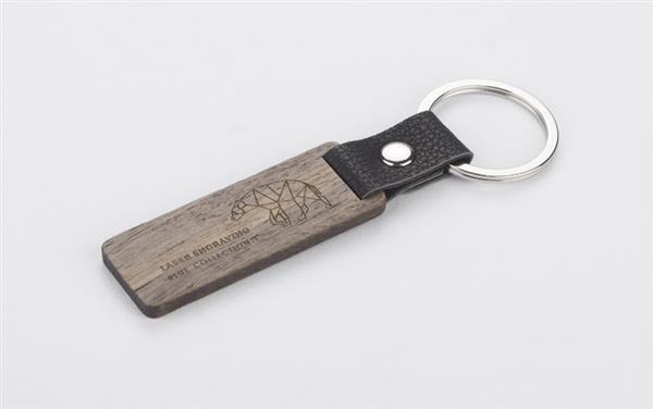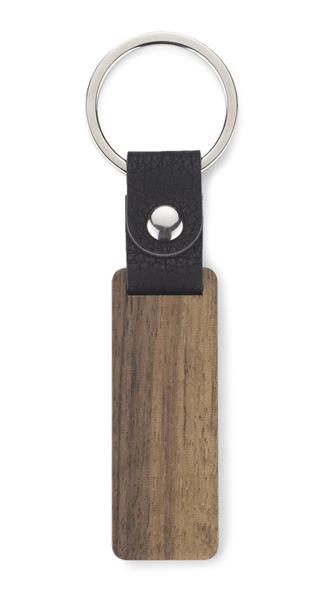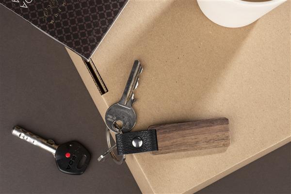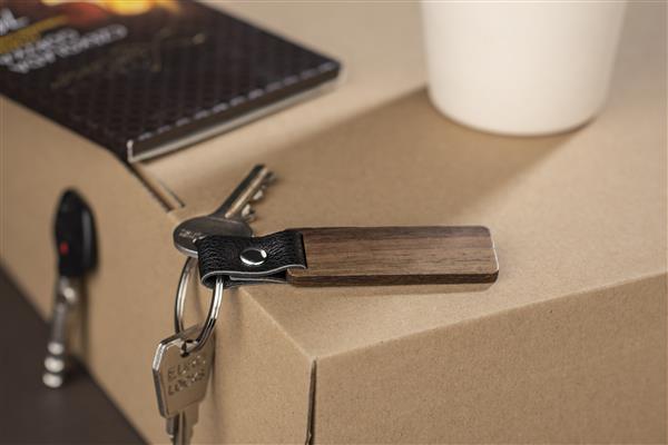 Brelok HASEL to elegancki brelok wykonany z drewna orzechowego. Metalowa obręcz zawieszona jest na skórzanym pasku.