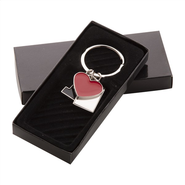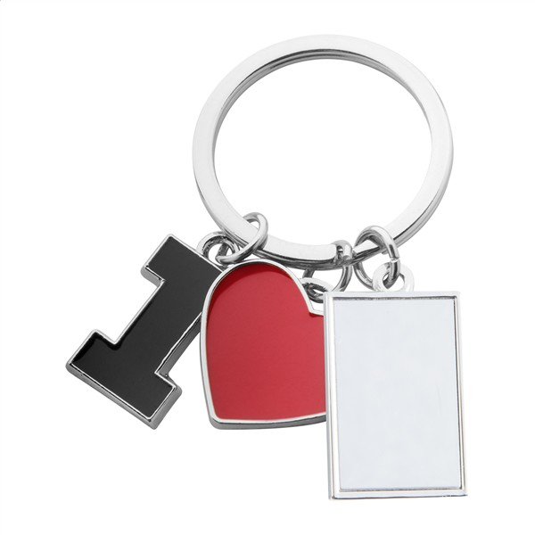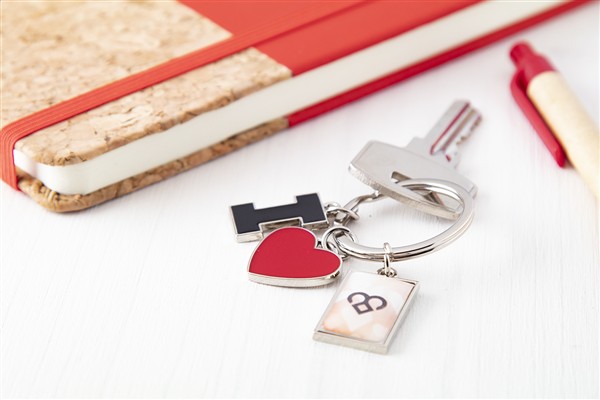 Metalowy brelok z trzema końcówkami w kształacie: litery „I”, kwadratu i serca. W czarnym kartoniku.