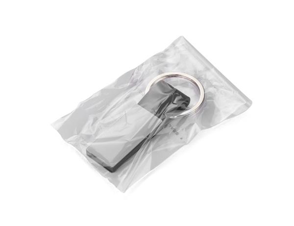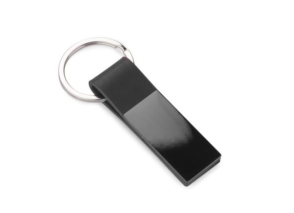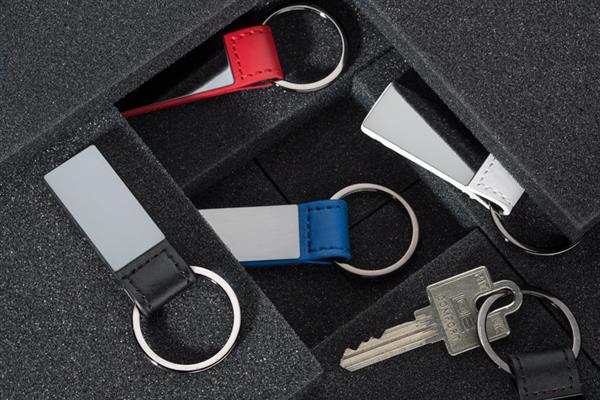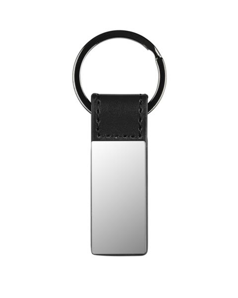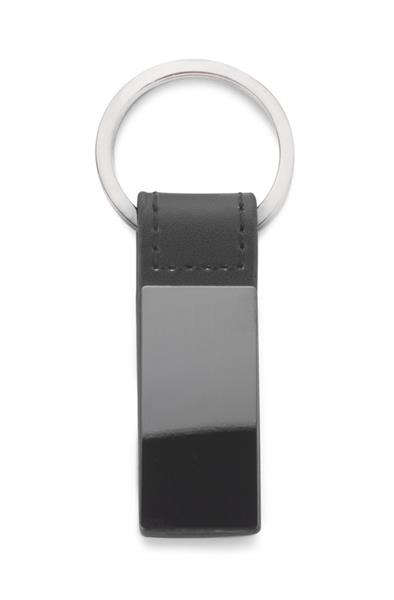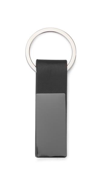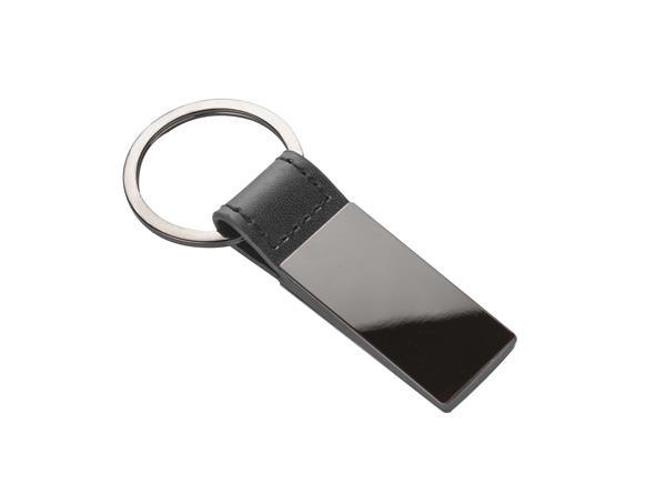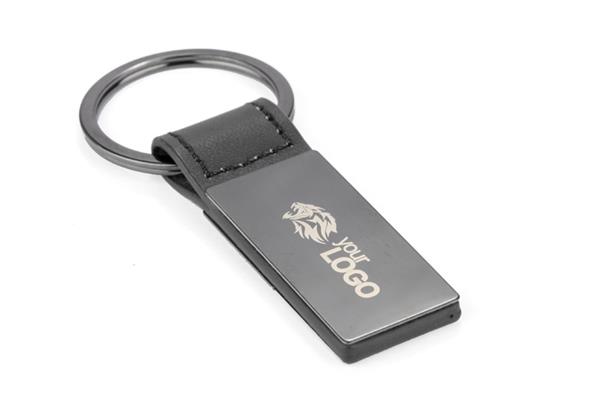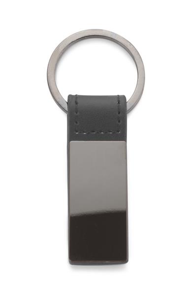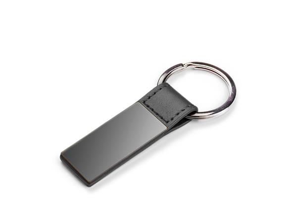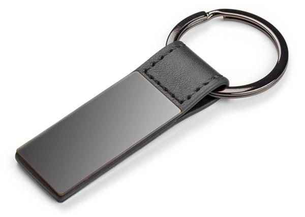 Elegancki dwustronny brelok wykonany z materiału skóropodobnego PU i metalu w kolorze grafitowym. Logo wygrawerujemy na metalowej blaszce.