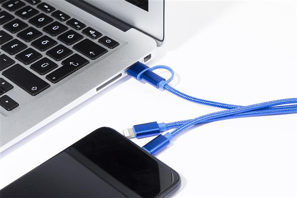 Kabel ładujący USB z recyklingowanego aluminium i RPET z brelokiem. Z wtyczkami micro USB, USB-C i Lightning. Z wejściami USB i USB-C.
