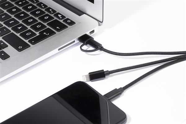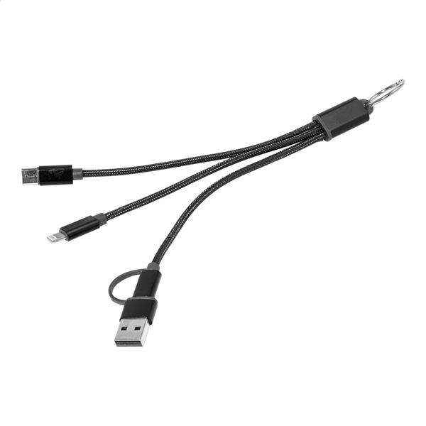 Kabel ładujący USB z recyklingowanego aluminium i RPET z brelokiem. Z wtyczkami micro USB, USB-C i Lightning. Z wejściami USB i USB-C.