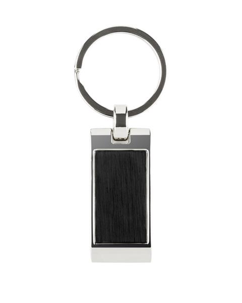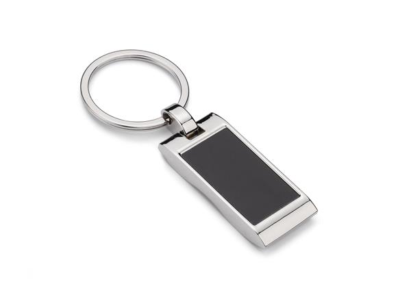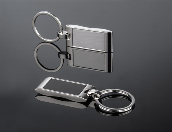 Metalowy brelok do kluczy z prostokątną, falowaną zawieszką. Logo grawerujemy na powierzchni breloka.