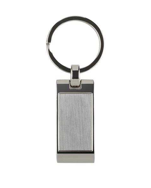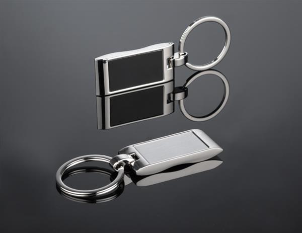 Metalowy brelok do kluczy z prostokątną, falowaną zawieszką. Logo grawerujemy na powierzchni breloka.