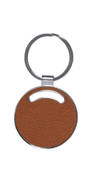 Metalowy brelok do kluczy pokryty skórą z recyklingu. Description: Metalowy brelok do kluczy pokryty skórą z recyklingu. Primary Color: brązowy Material 2: Metal Shape: okrąg Material 1: Skóra z recyklingu Rozmiar: o40×4 mm