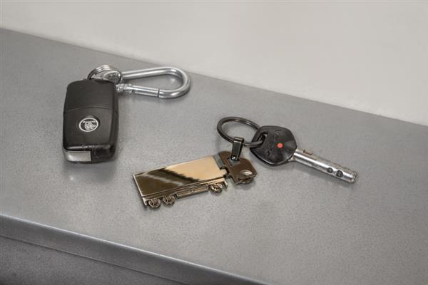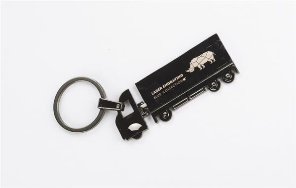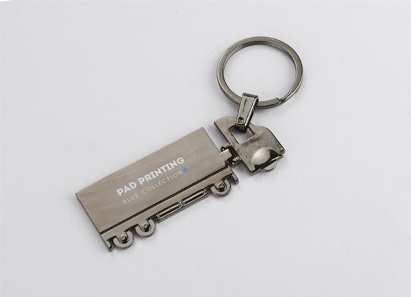 Brelok do kluczy w kształcie TIRa, dwustronny, wykonany z metalu.