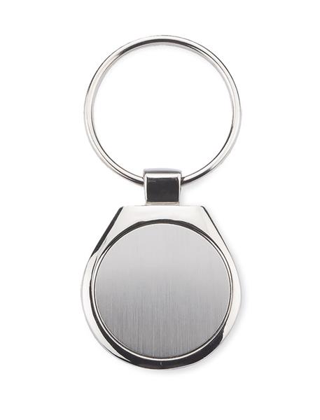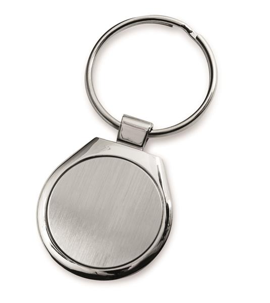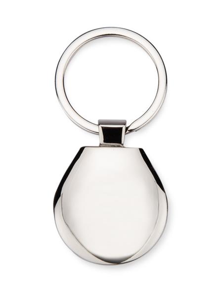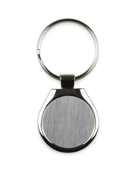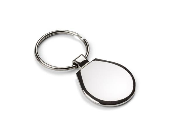 Brelok o klasycznym kształcie wykonany z chromowanego metalu. Logo wygrawerujemy na blaszce umieszczonej wewnątrz.