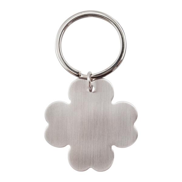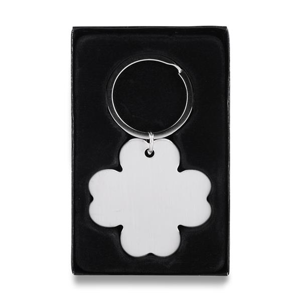 Wykonany ze stali nierdzewnej brelok w kształcie koniczynki. Pakowany w czarne opakowanie upominkowe.