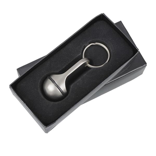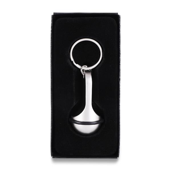 Masywny metalowy brelok. Pakowany w czarne opakowanie upominkowe.