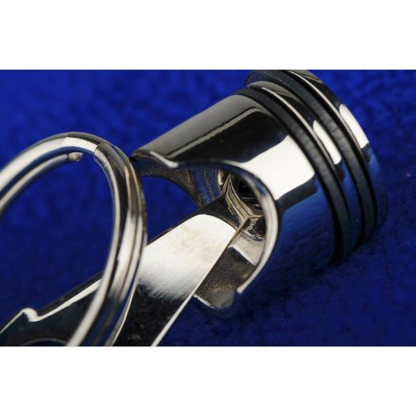 Metalowy brelok w kształcie tłoka samochodowego. Pakowany w czarne opakowanie upominkowe.