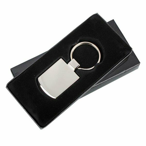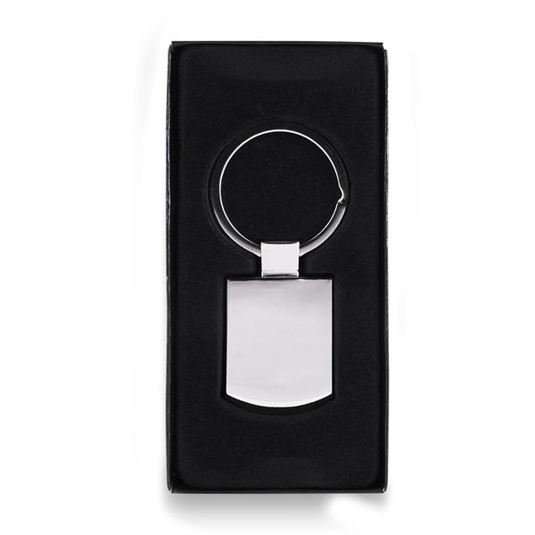 Elegancki brelok na klucze wykonany z metalu. Doskonale nadaje się na akcje promocyjne. Pakowany w czarne kartonowe opakowanie upominkowe.