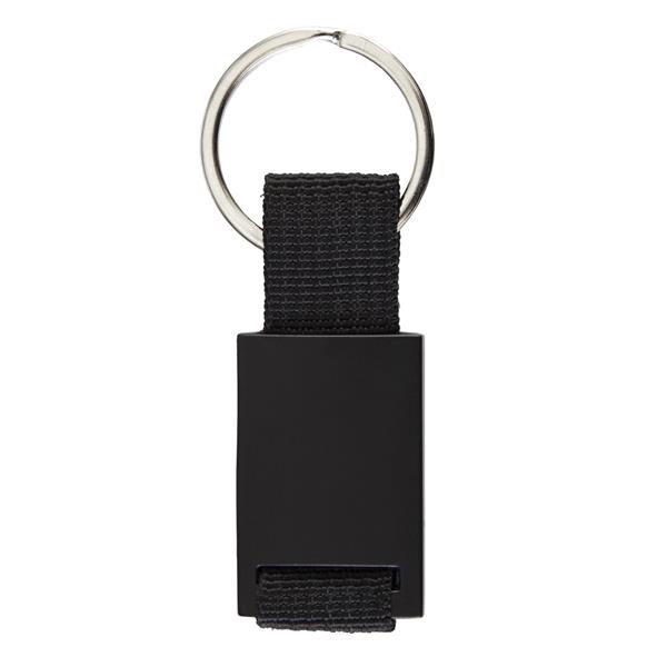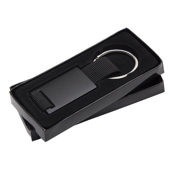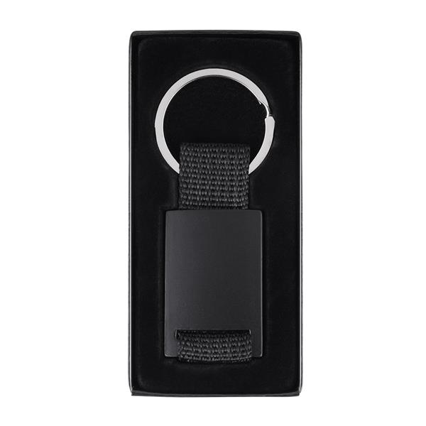 Elegancki brelok o czarnej matowej powierzchni. Wykonany z metalu i poliestru. Pakowany w czarne pudełko upominkowe.