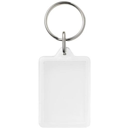 Prostokątny breloczek Y1 z metalowym pękiem na klucze. Metalowy pierścień cechuje płaski profil, który idealnie nadaje się do wysyłek. Wymiary wkładu do druku: 3,5 cm x 2,4 cm.