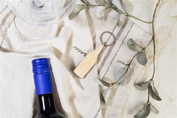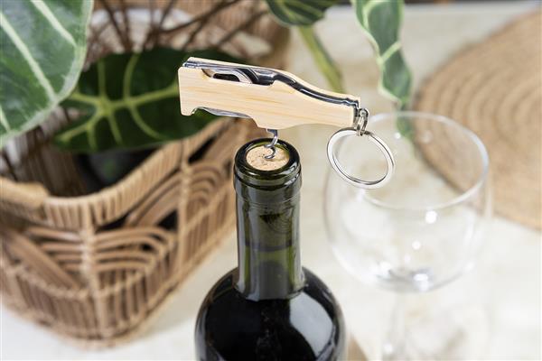 Wielofunkcyjny brelok w kształcie butelki, wykonany ze stali nierdzewnej i bambusa. Posiada 4 funkcje: nóż, korkociąg, otwieracz do butelek i pilnik.