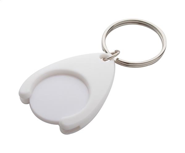 Plastikowy brelok z miejscem na monetę. Wielkość monety: o24×2 mm.