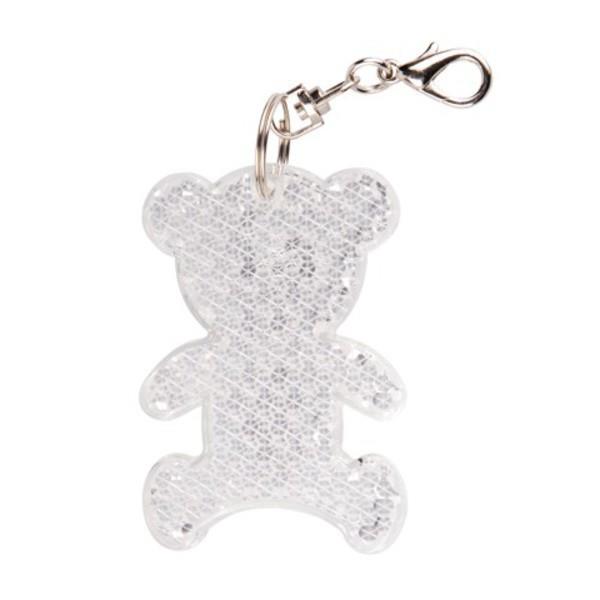 Brelok w kształcie misia z powłoką odbijającą światło, z karabińczykiem.